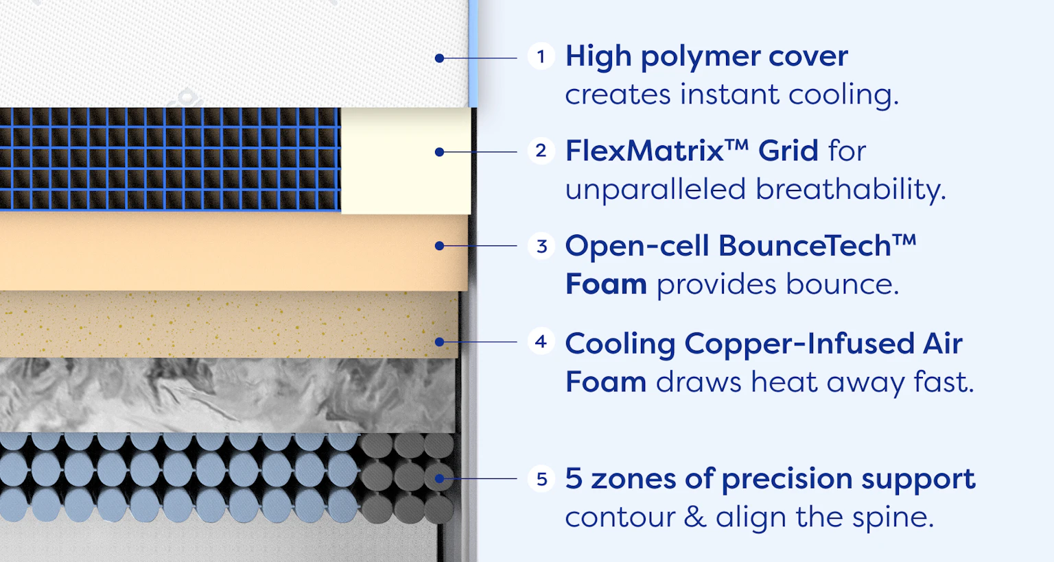 - Open-cell BounceTech™ foam provides durable cushioning without heat retention.