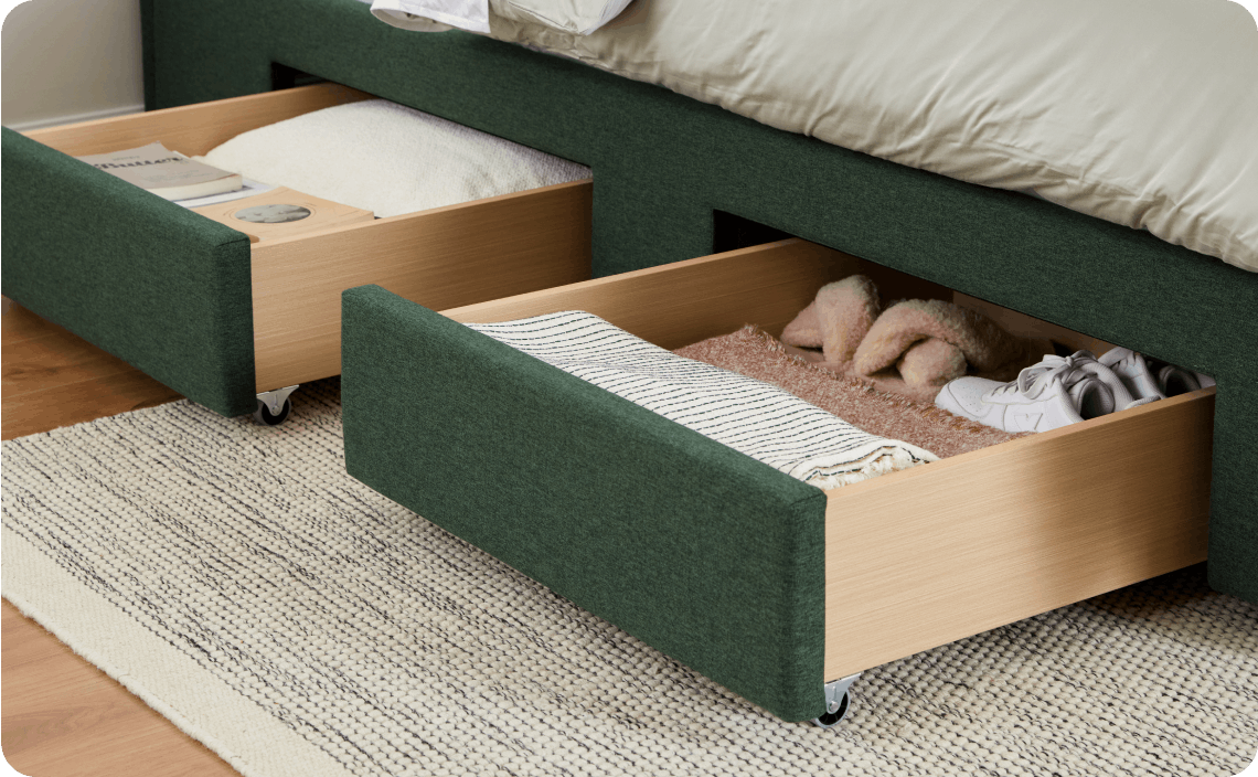 Changing your bed with the convenience of generous under-bed storage. Eliminating clutter, the Luna Storage Bed Frame features four roomy drawers — ideal for stashing your spare pillows, quilts and sheet sets.