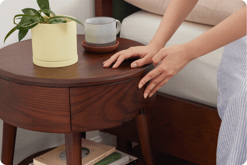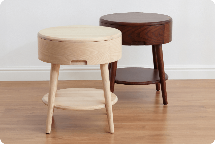 - Scandi-inspired circular bedside table with soft-close drawer and shelf.